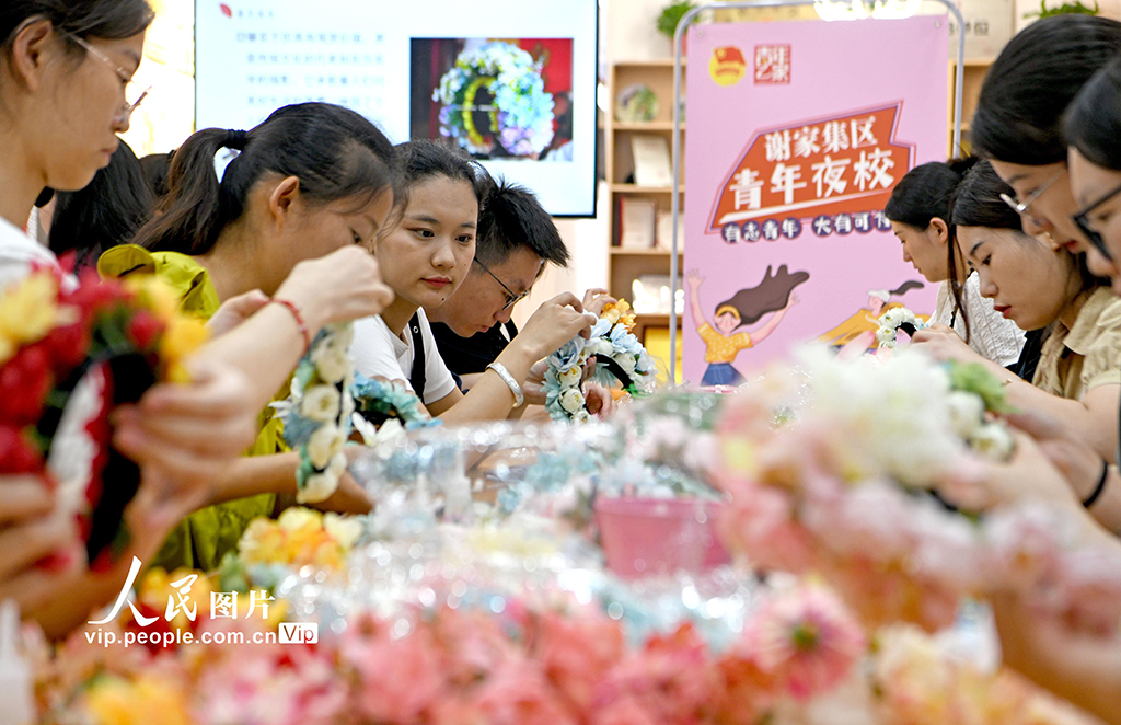 2024年8月8日,安徽省淮南市謝家集區(qū)青年下班后在青年夜校里免費(fèi)學(xué)習(xí)非遺簪花,豐富業(yè)余生活…