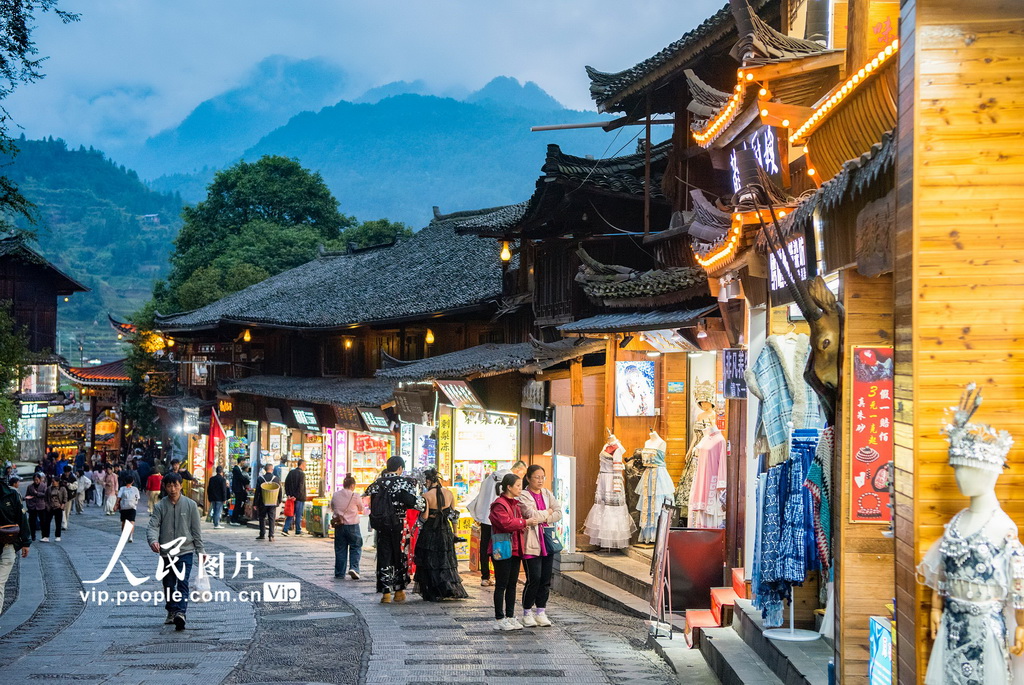 2024年10月15日夜晚,貴州省黔東南苗族侗族自治州雷山縣西江千戶苗寨燈火輝煌,吊腳樓與遠(yuǎn)…